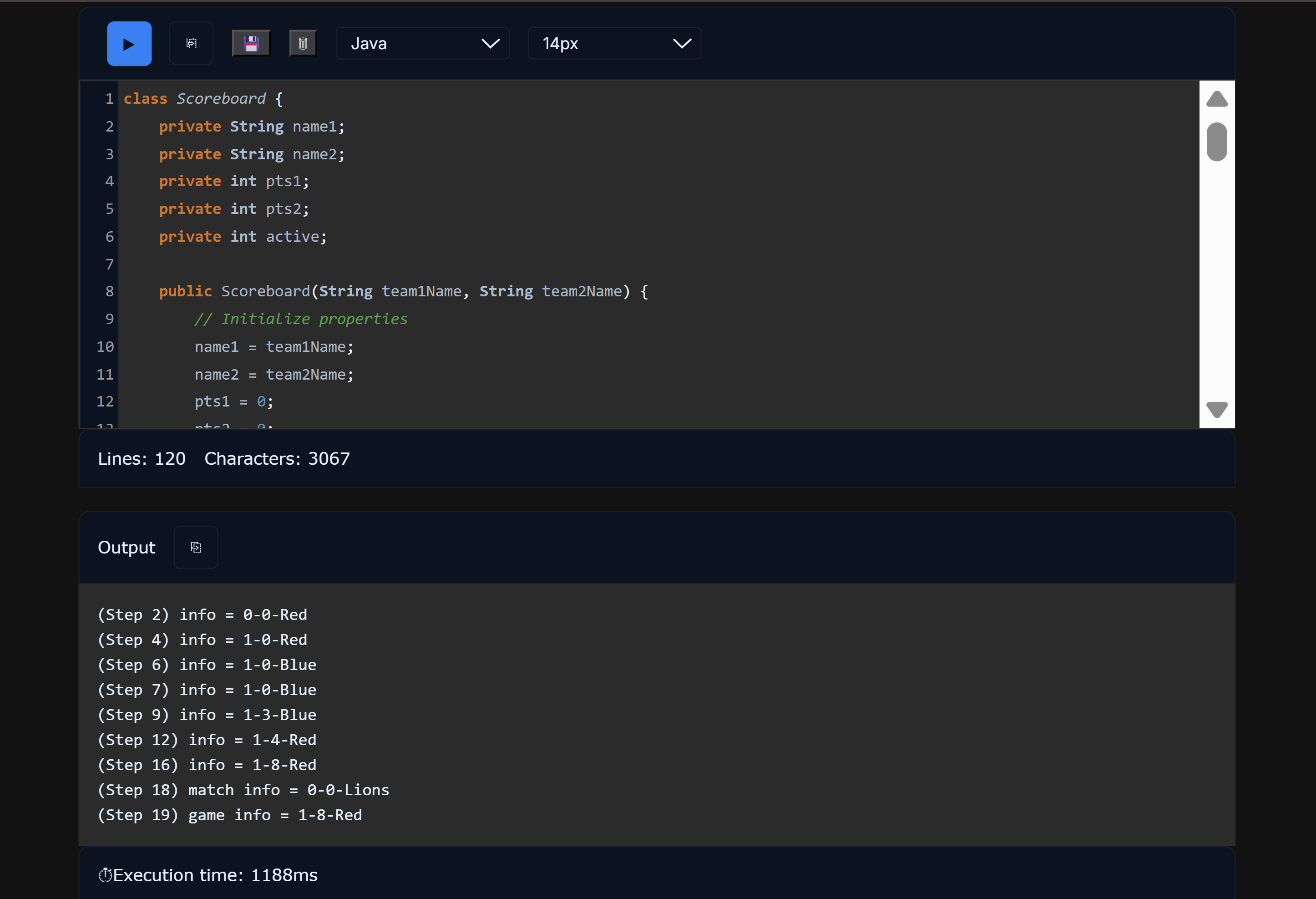 Scoreboard game = new Scoreboard("Red", "Blue");